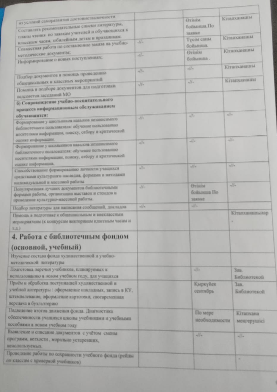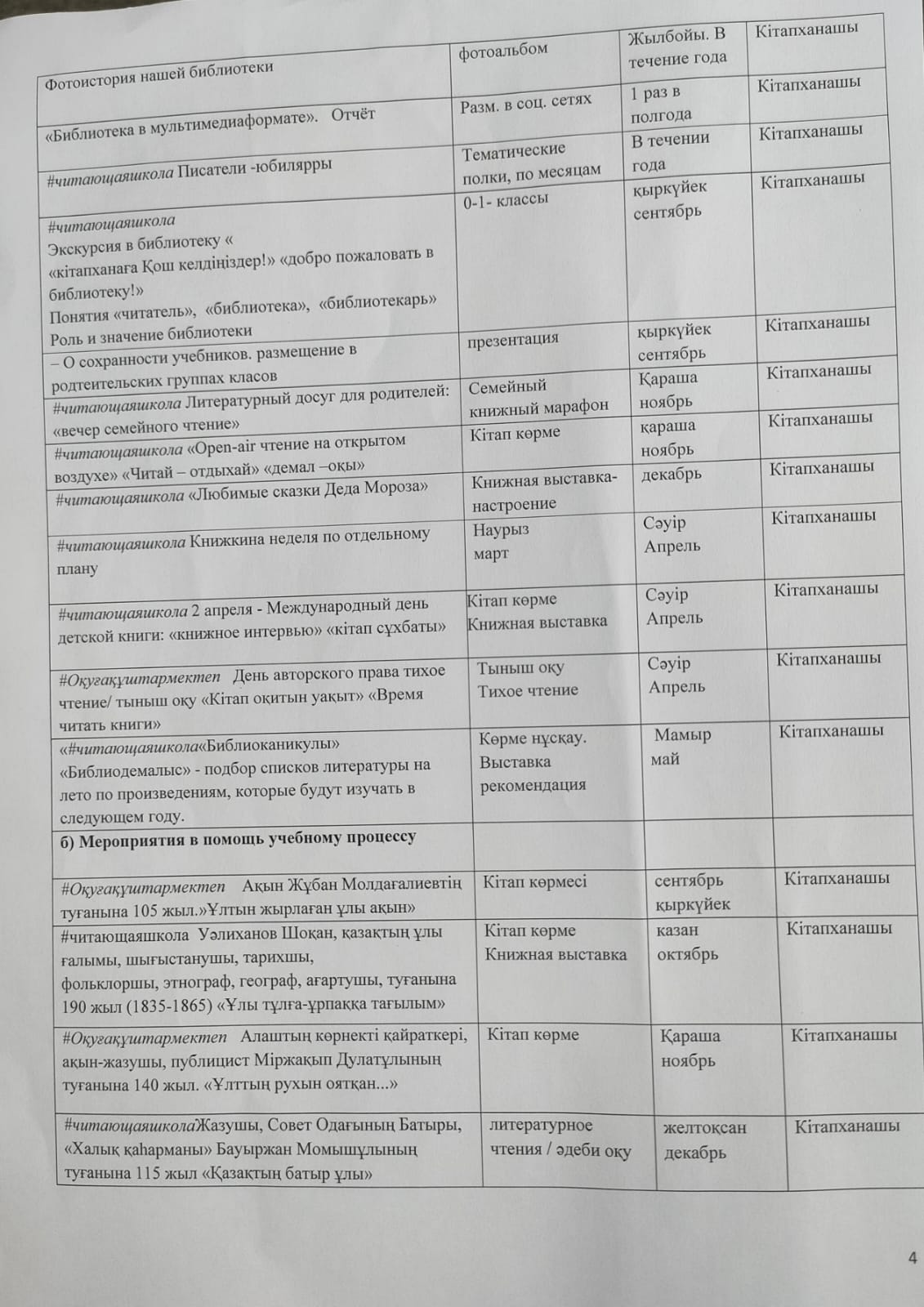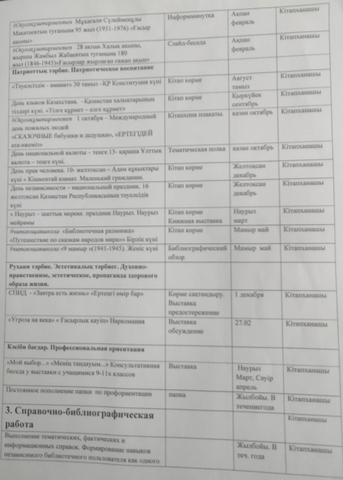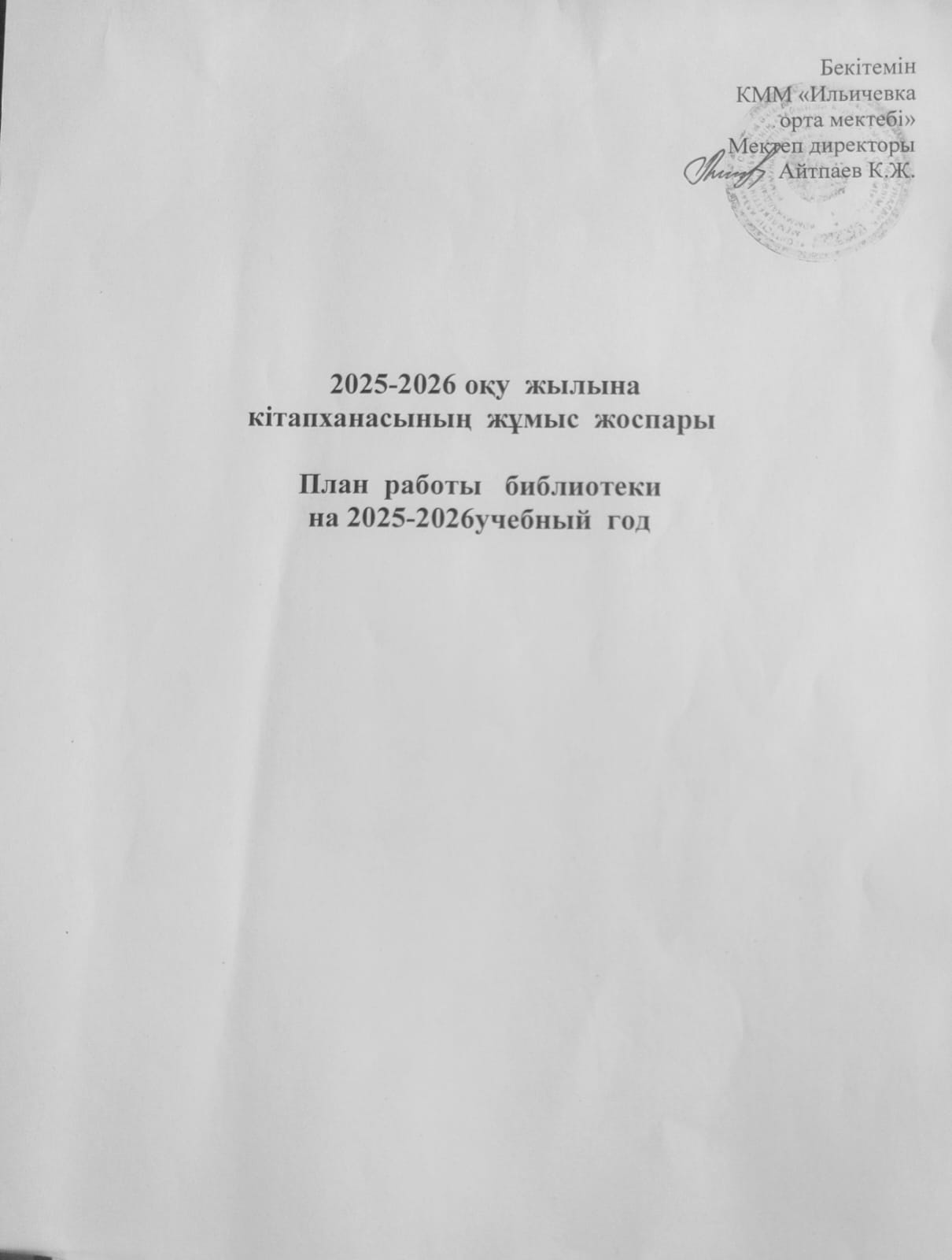 Кітапхана жылдық жоспары — «Тайынша ауданының білім бөлімі» КММ «Ильичевка орта мектебі» КММ