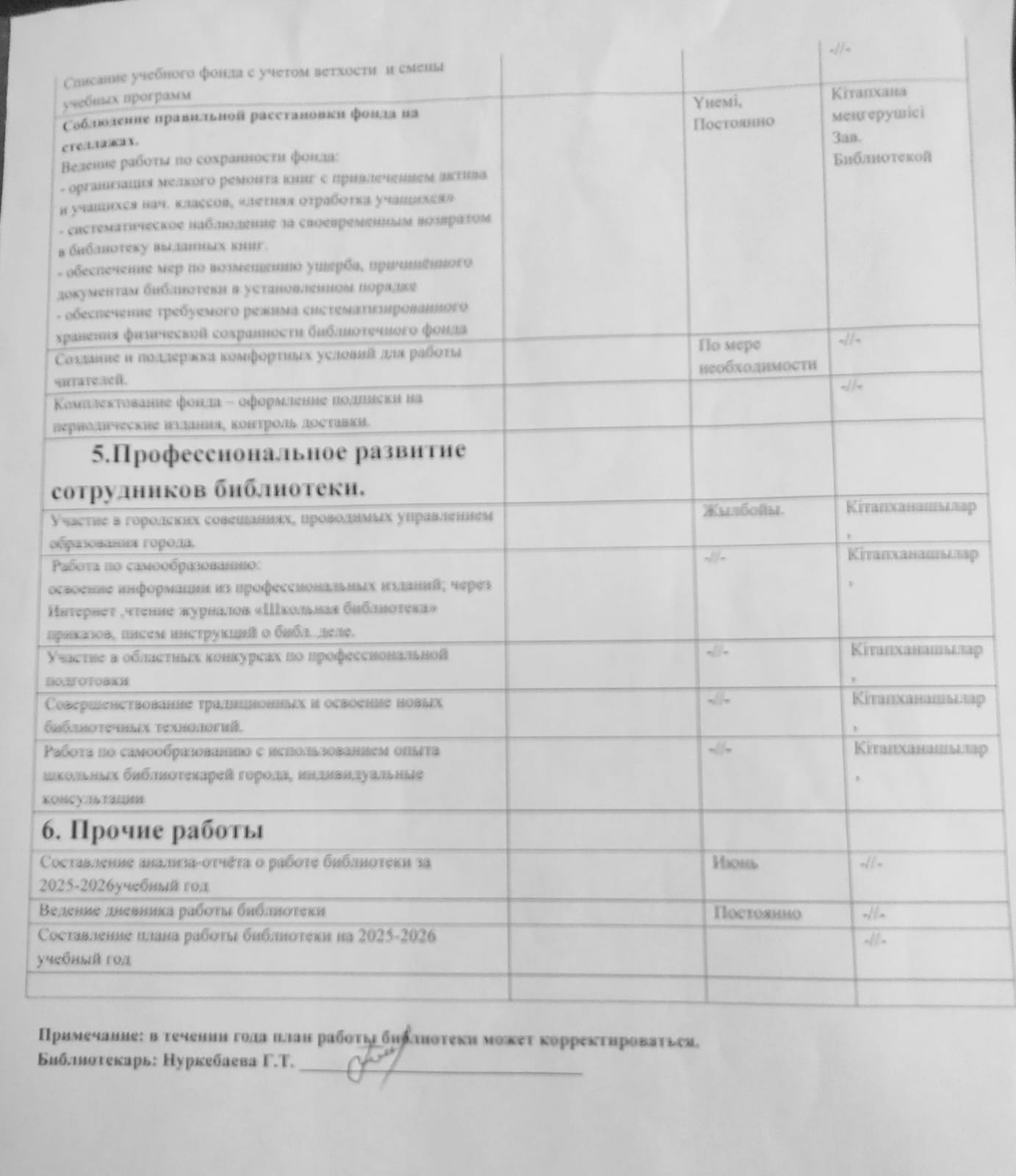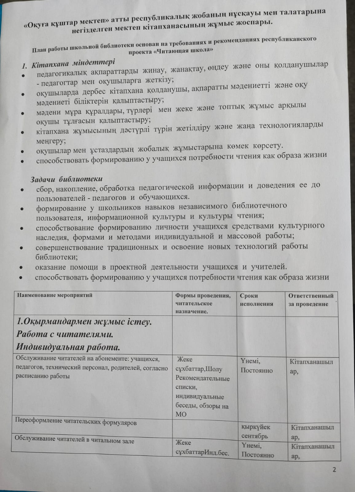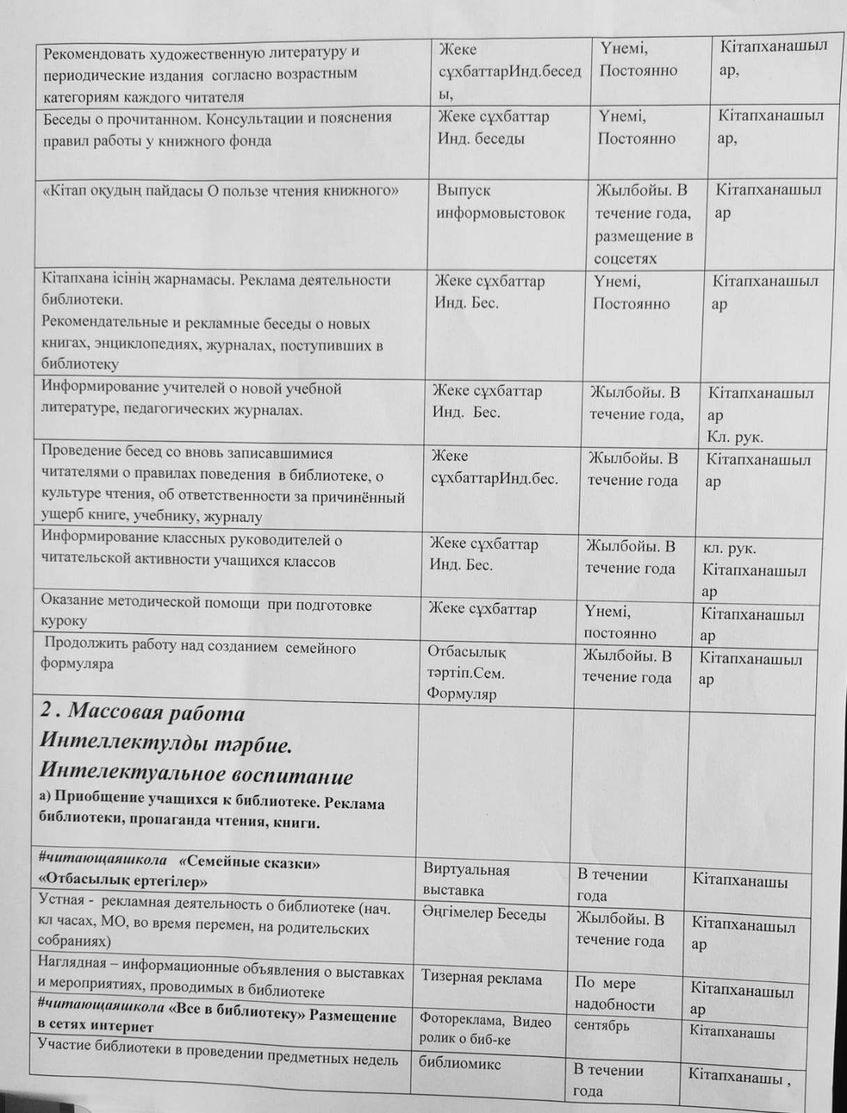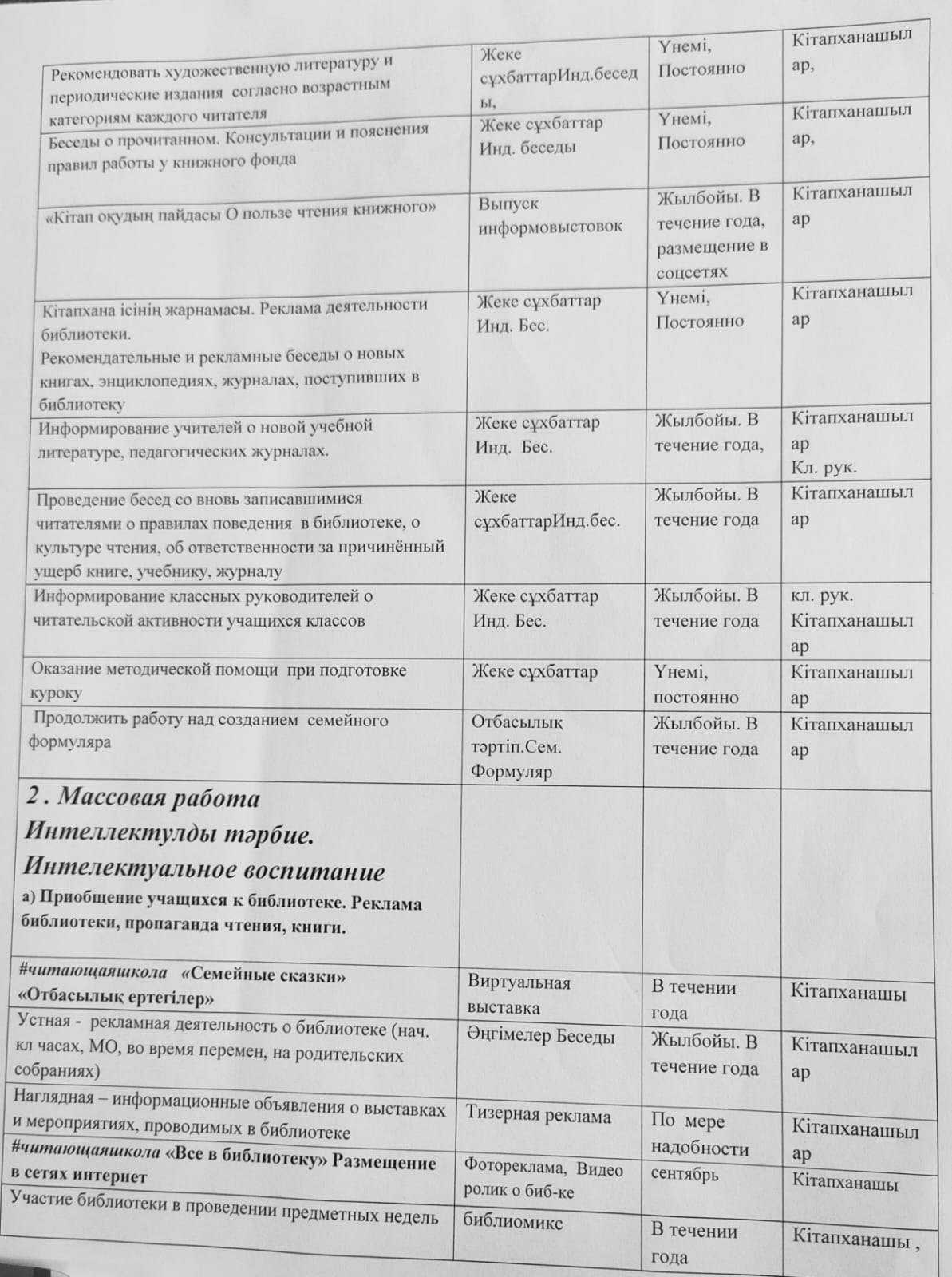 Кітапхана жылдық жоспары — «Тайынша ауданының білім бөлімі» КММ «Ильичевка орта мектебі» КММ